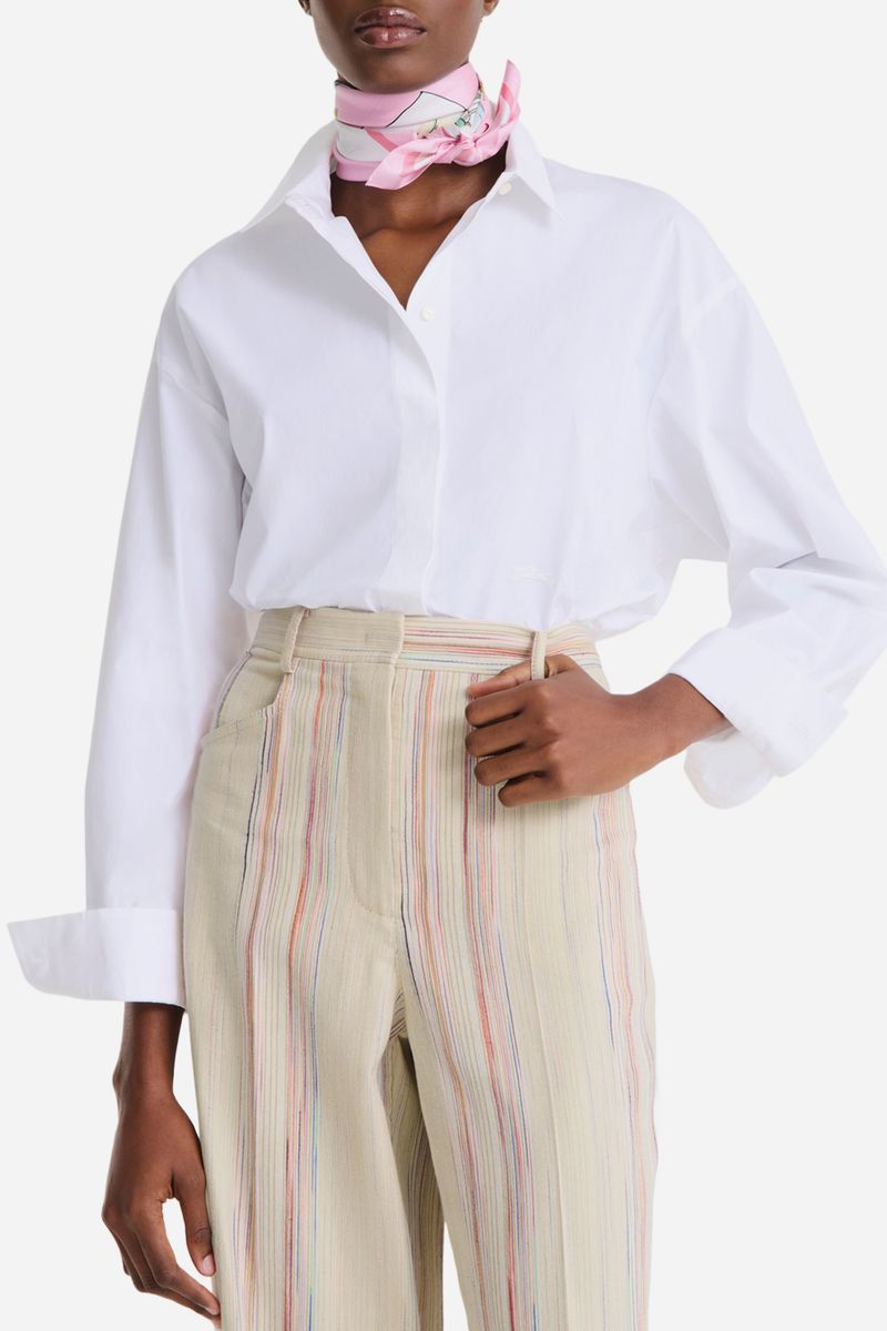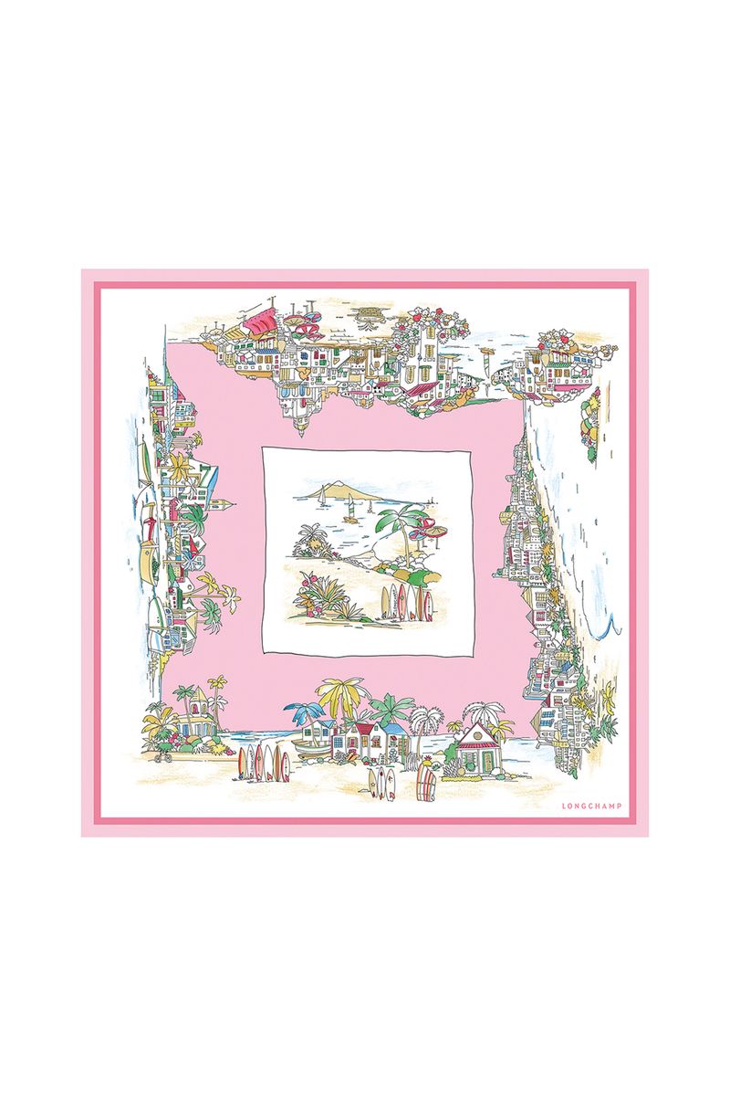 Este estampado revela uma cena que capta o espírito do verão. As pranchas de surf da Longchamp alinham-se na praia, rodeadas por palmeiras, guarda-sóis, cabanas de praia, barcos e velas, tudo sobre areia dourada de frente para um mar azul brilhante.