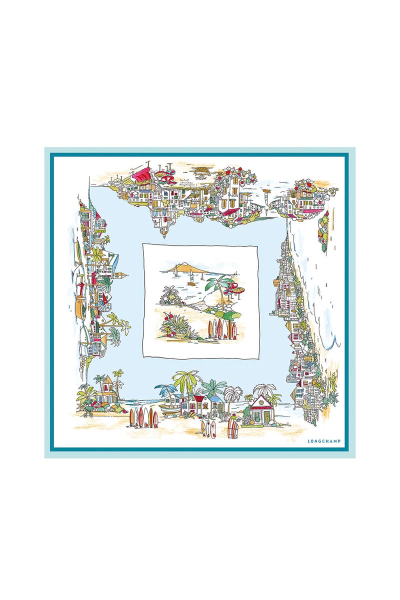 Este estampado revela uma cena que capta o espírito do verão. As pranchas de surf da Longchamp alinham-se na praia, rodeadas por palmeiras, guarda-sóis, cabanas de praia, barcos e velas, tudo sobre areia dourada de frente para um mar azul brilhante.
