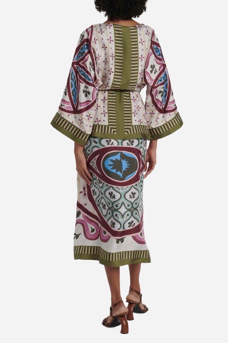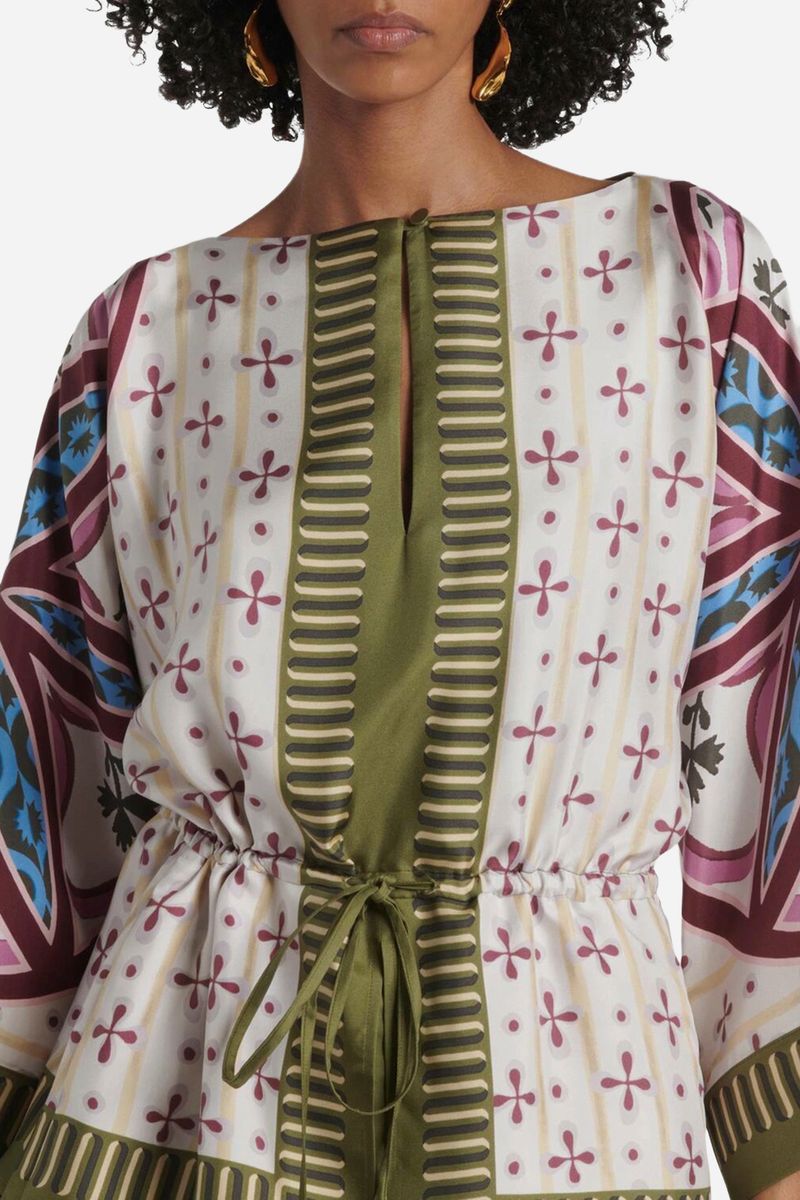 Um vestido pensado para um encontro romântico, este luxuoso look laissez-fare vem com uma elegante gola mandarim, uma bainha romântica tipo cachecol e uma estampa perfeita criada por nossos artesãos italianos. Use-o com tênis de cano alto para um passeio diurno pela Lungomare e, mais tarde, calce saltos para a festa no Palazzo de Portofino.